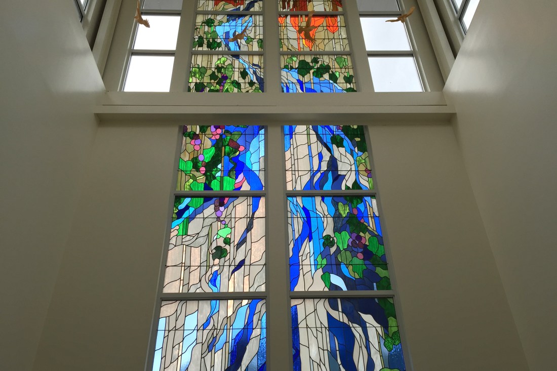 When I was drawing this design for glass, I wondered what sort of leaves Ezekiel and John envisioned. What sort of leaves would sooth the wounds of the nations? I sketched grape leaves. I painted grape vines curling around the contours of the flow of the water, an allusion to Jesus’s statement that he is the vine and we are in the branches. When we remain connected to the vine, we bear fruit; but apart from it, we are barren. In the case of the vine and the river, we are conduits of life derived from one source: Christ.